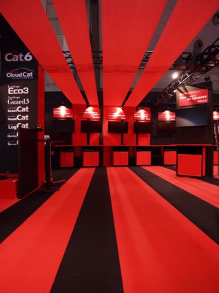 The design divides the colors between red and black and features Motex’s coporate color ‘Motex Red’. The drop paper and sharp, light stretch form fabric fits Motex’s sophisticated image perfectly and expresses the ‘bundle of information’ which visualizes the complex blending of security infrastructure. Lightly objectified network lines run freely around the Motex Red colored interior of the booth. The exhibition ran from May 11th-13th 2011 at Tokyo Big Site.