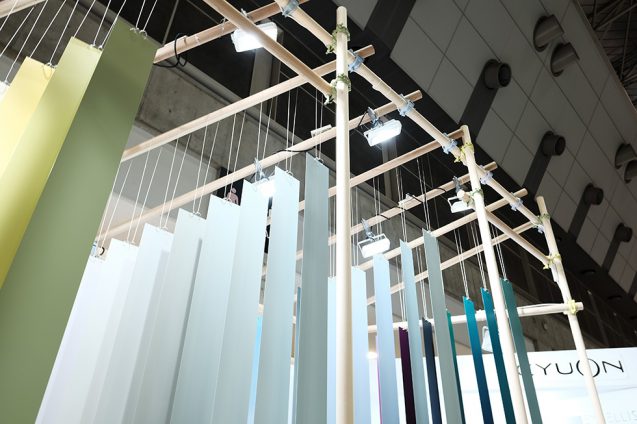 展示ブースは、建築足場パイプから着想し、再利用可能な「モクタンカン」のヤグラ組みとし、七夕のような短冊状のスケープカラーをつるすことで、軽やかな色の差異と変化が楽しめる事を意識している。また、モクタンカンのクランプは新たに開発したレモンスケープカラーで彩られ、再利用可能なアイテムの新たな見え方を提案している。