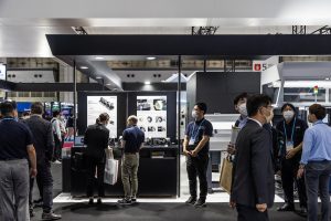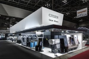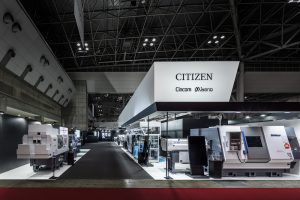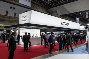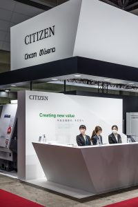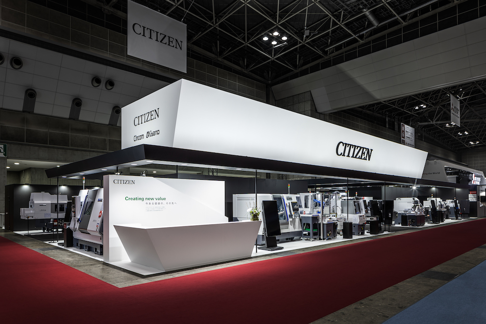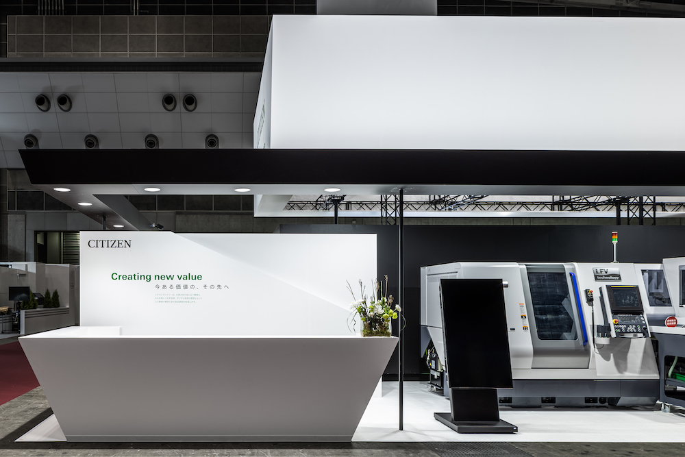 Booth design for JIMTOF 2022 (Japan International Machine Tool Fair) by Citizen Machinery, a company that develops total solutions incorporating peripheral equipment, machining technology, automation and labour-saving technology in CNC and FA. At JIMTOF, where the world's leading Japanese FA/machine tool manufacturers are all lined up, we aimed to create a sense of anticipation leading to the exhibition concept of 'Creating new value, going beyond the value we have now', and to design a minimalist, delicate booth that would convey Citizen Machinery's pride and dignity.
